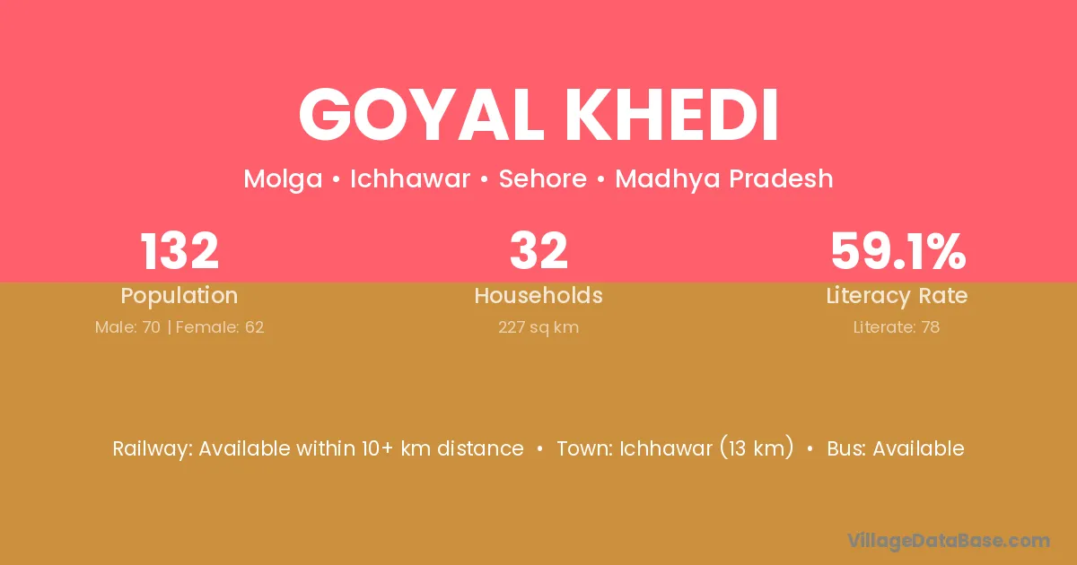 Ichhawar (13 km) is the nearest town to Goyal Khedi village for major economic activities and is located approximately 13 km away.