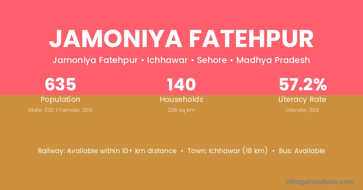 Ichhawar (18 km) is the nearest town to Jamoniya Fatehpur village for major economic activities and is located approximately 18 km away.