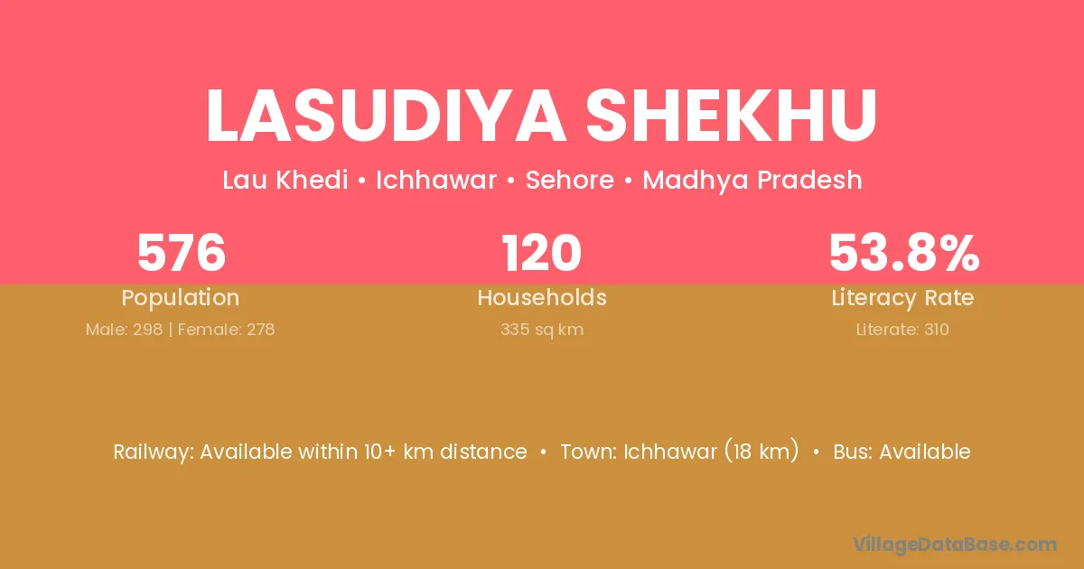 Lasudiya Shekhu village has a total population of 576 people, of which 298 are males and 278 are females.