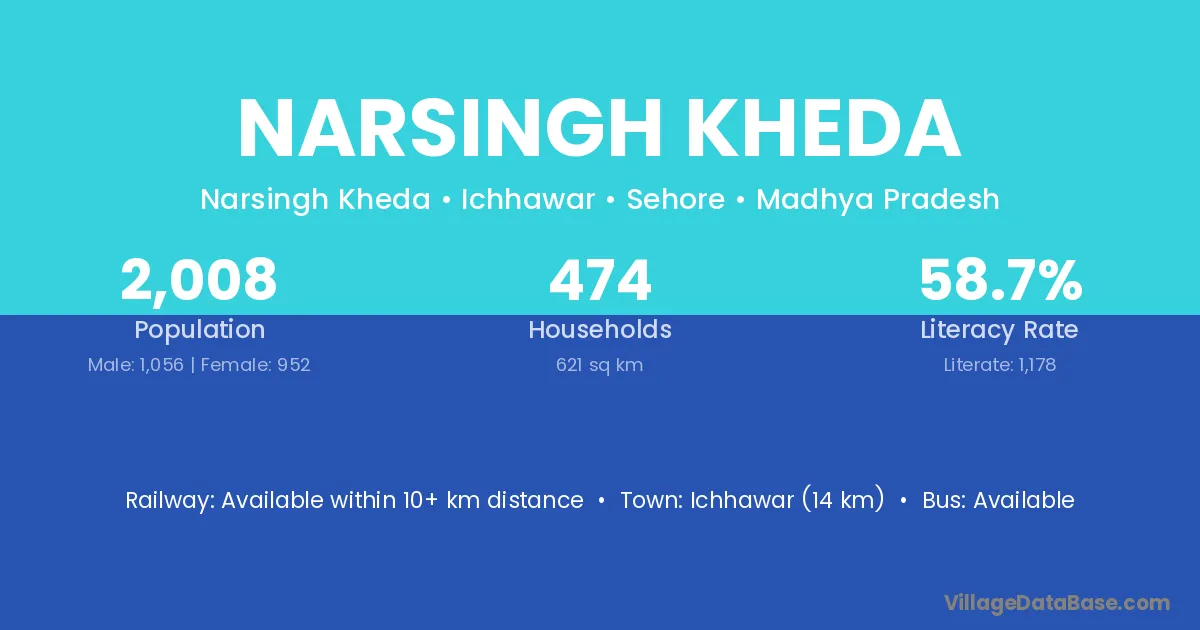 Ichhawar (14 km) is the nearest town to Narsingh Kheda village for major economic activities and is located approximately 14 km away.