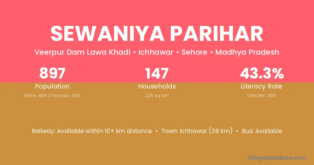 Ichhawar (39 km) is the nearest town to Sewaniya Parihar village for major economic activities and is located approximately 39 km away.