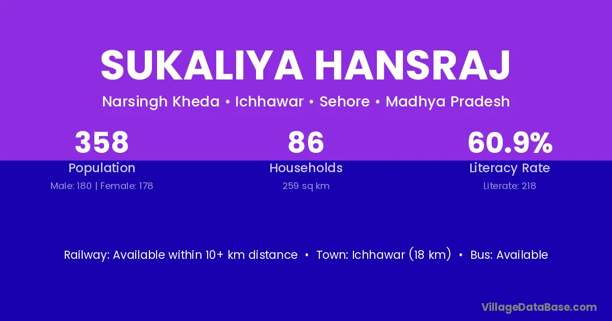 Ichhawar (18 km) is the nearest town to Sukaliya Hansraj village for major economic activities and is located approximately 18 km away.