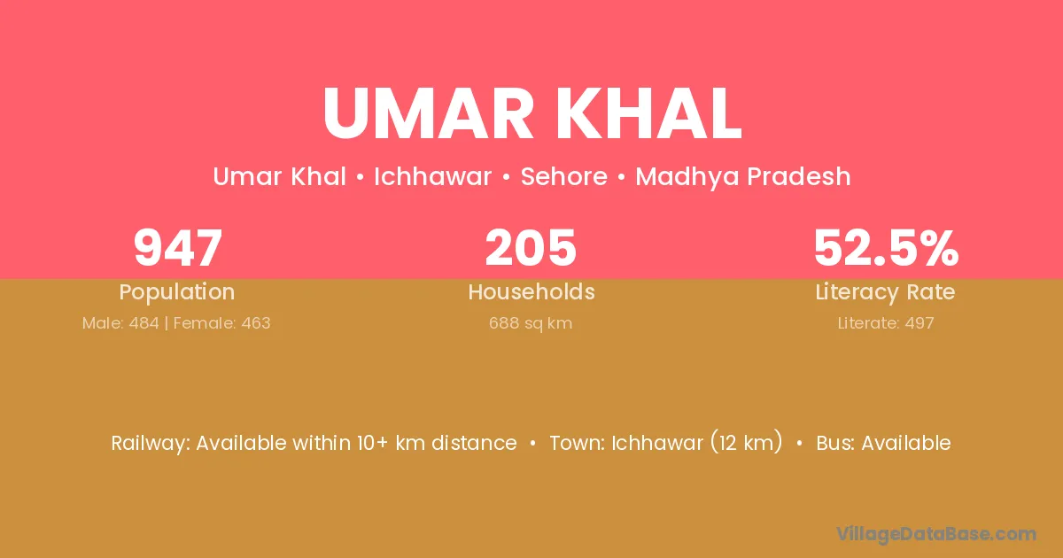 Ichhawar (12 km) is the nearest town to Umar Khal village for major economic activities and is located approximately 12 km away.