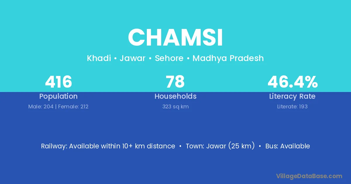 Jawar (25 km) is the nearest town to Chamsi village for major economic activities and is located approximately 25 km away.