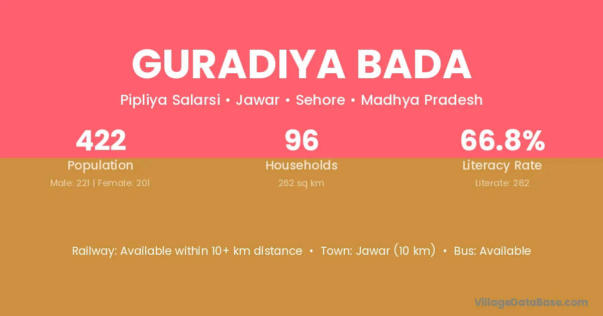 Guradiya Bada village has a total population of 422 people, of which 221 are males and 201 are females.