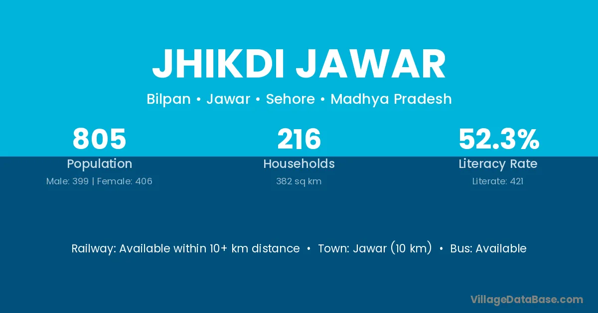 Jawar (10 km) is the nearest town to Jhikdi Jawar village for major economic activities and is located approximately 10 km away.