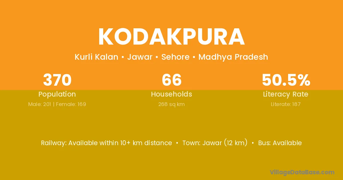 Jawar (12 km) is the nearest town to Kodakpura village for major economic activities and is located approximately 12 km away.