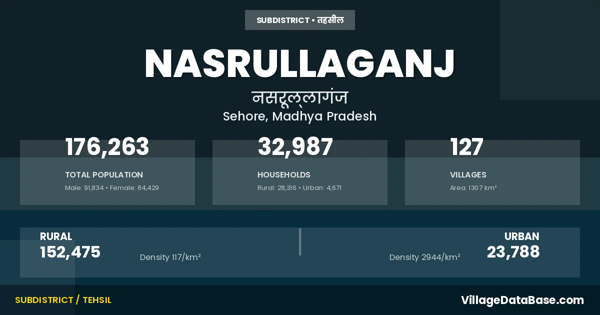 According to the 2011 census The total area of Nasrullaganj Tehsil is 1307 km², with a population of 176263 people. The population density is 135 inhabitants per square kilometre, and there are approximately 32987 houses in the sub district.