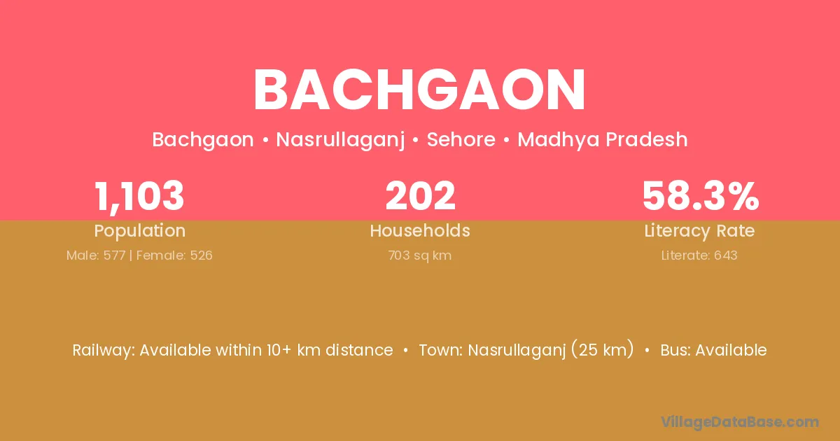 Nasrullaganj (25 km) is the nearest town to Bachgaon village for major economic activities and is located approximately 25 km away.