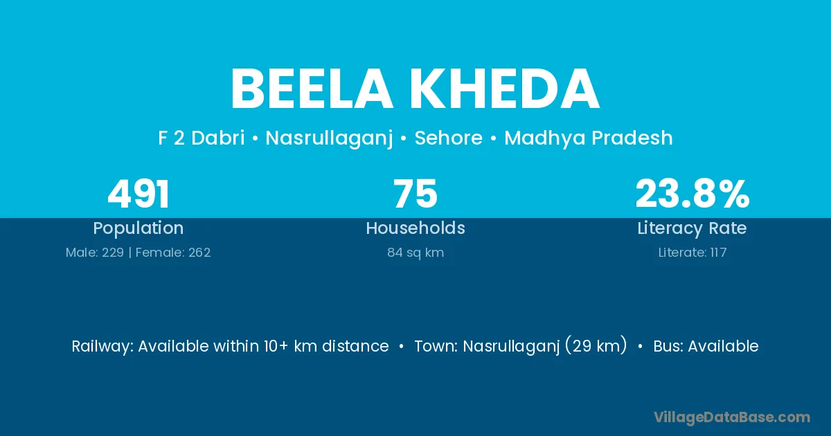 Nasrullaganj (29 km) is the nearest town to Beela Kheda village for major economic activities and is located approximately 29 km away.