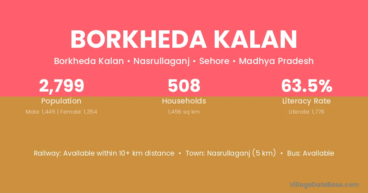Nasrullaganj (5 km) is the nearest town to Borkheda Kalan village for major economic activities and is located approximately 5 km away.