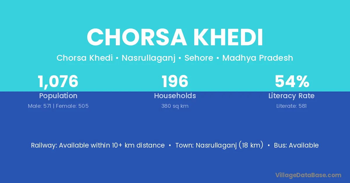 Nasrullaganj (18 km) is the nearest town to Chorsa Khedi village for major economic activities and is located approximately 18 km away.