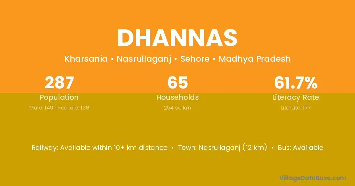 Nasrullaganj (12 km) is the nearest town to Dhannas village for major economic activities and is located approximately 12 km away.