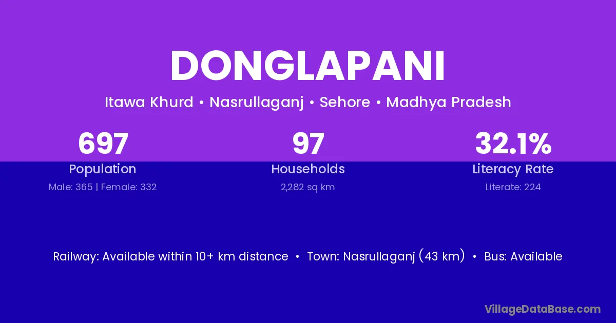 Nasrullaganj (43 km) is the nearest town to Donglapani village for major economic activities and is located approximately 43 km away.