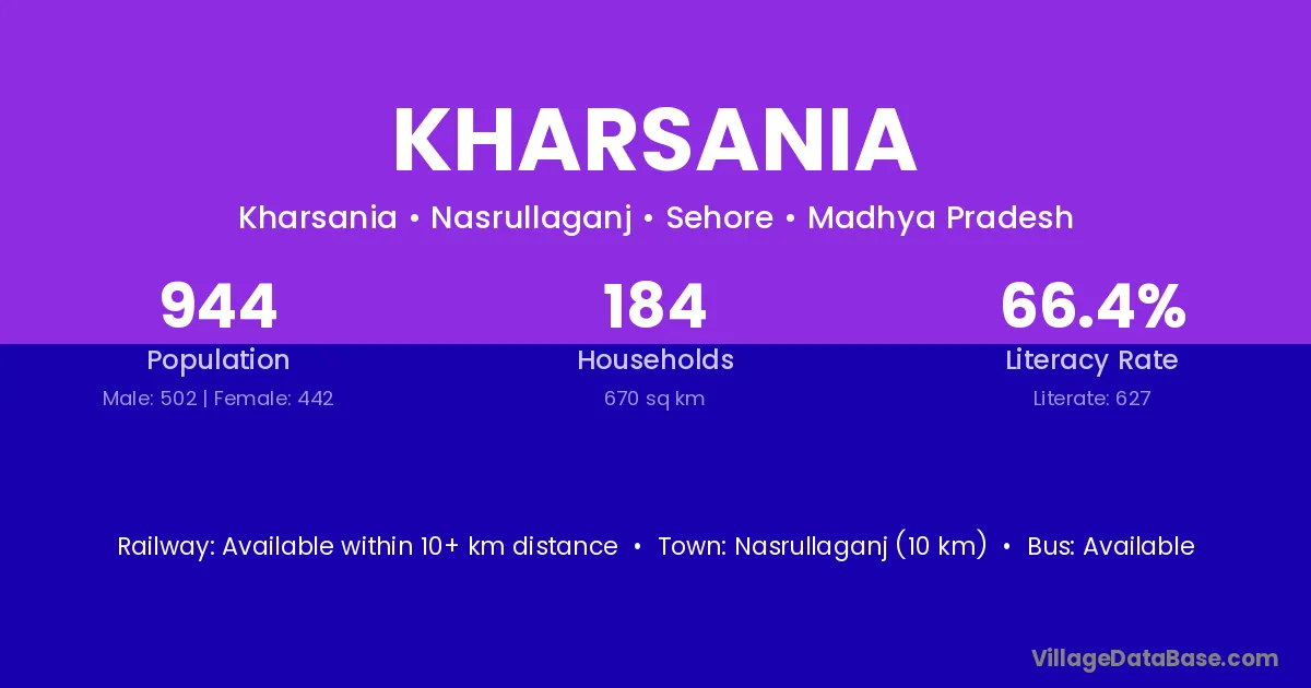Nasrullaganj (10 km) is the nearest town to Kharsania village for major economic activities and is located approximately 10 km away.