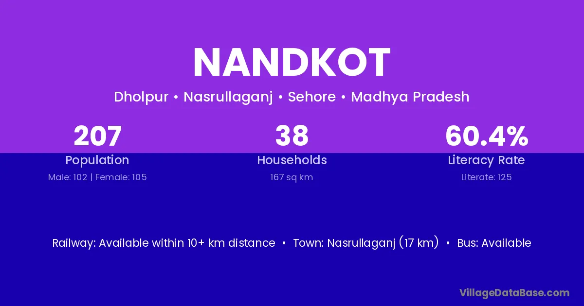Nasrullaganj (17 km) is the nearest town to Nandkot village for major economic activities and is located approximately 17 km away.