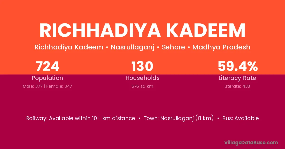 Nasrullaganj (8 km) is the nearest town to Richhadiya Kadeem village for major economic activities and is located approximately 8 km away.