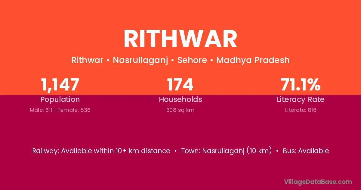 Nasrullaganj (10 km) is the nearest town to Rithwar village for major economic activities and is located approximately 10 km away.