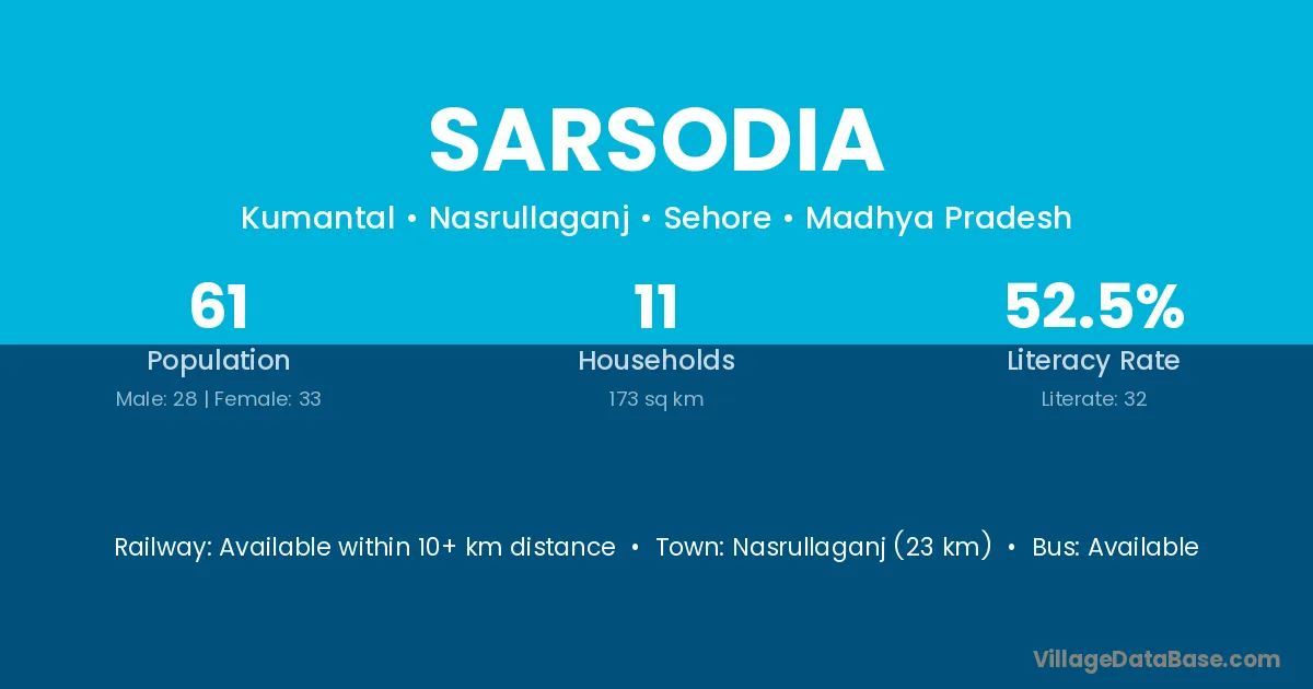 Nasrullaganj (23 km) is the nearest town to Sarsodia village for major economic activities and is located approximately 23 km away.