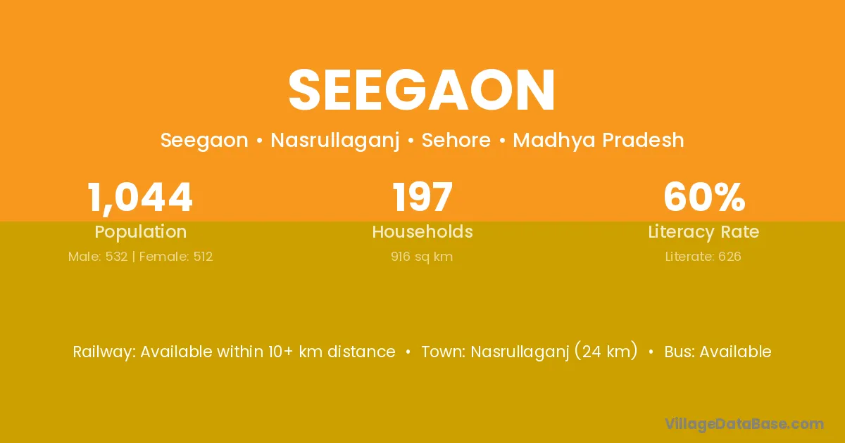Nasrullaganj (24 km) is the nearest town to Seegaon village for major economic activities and is located approximately 24 km away.