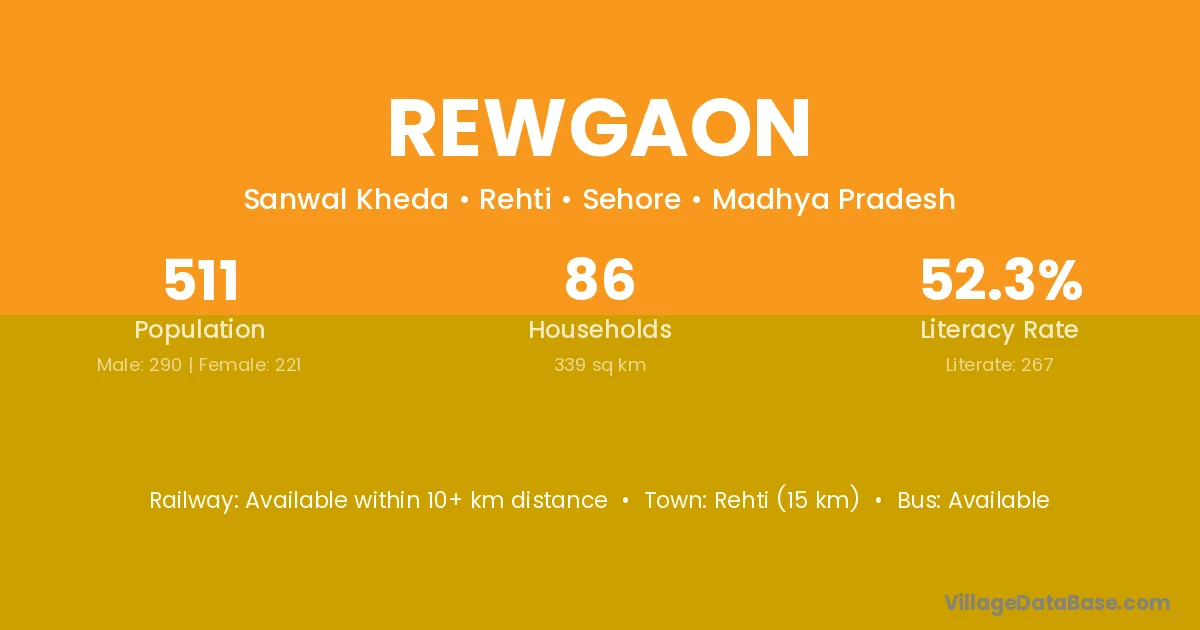 Rehti (15 km) is the nearest town to Rewgaon village for major economic activities and is located approximately 15 km away.