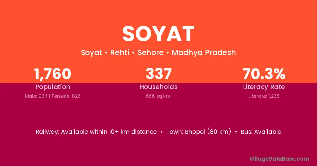 Bhopal (80 km) is the nearest town to Soyat village for major economic activities and is located approximately 80 km away.