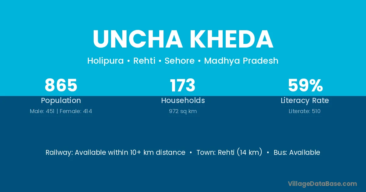 Rehti (14 km) is the nearest town to Uncha Kheda village for major economic activities and is located approximately 14 km away.