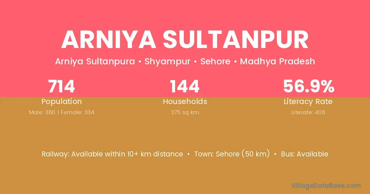 Sehore (50 km) is the nearest town to Arniya Sultanpur village for major economic activities and is located approximately 50 km away.