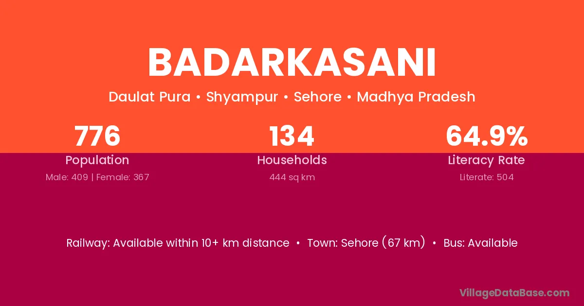 Sehore (67 km) is the nearest town to Badarkasani village for major economic activities and is located approximately 67 km away.