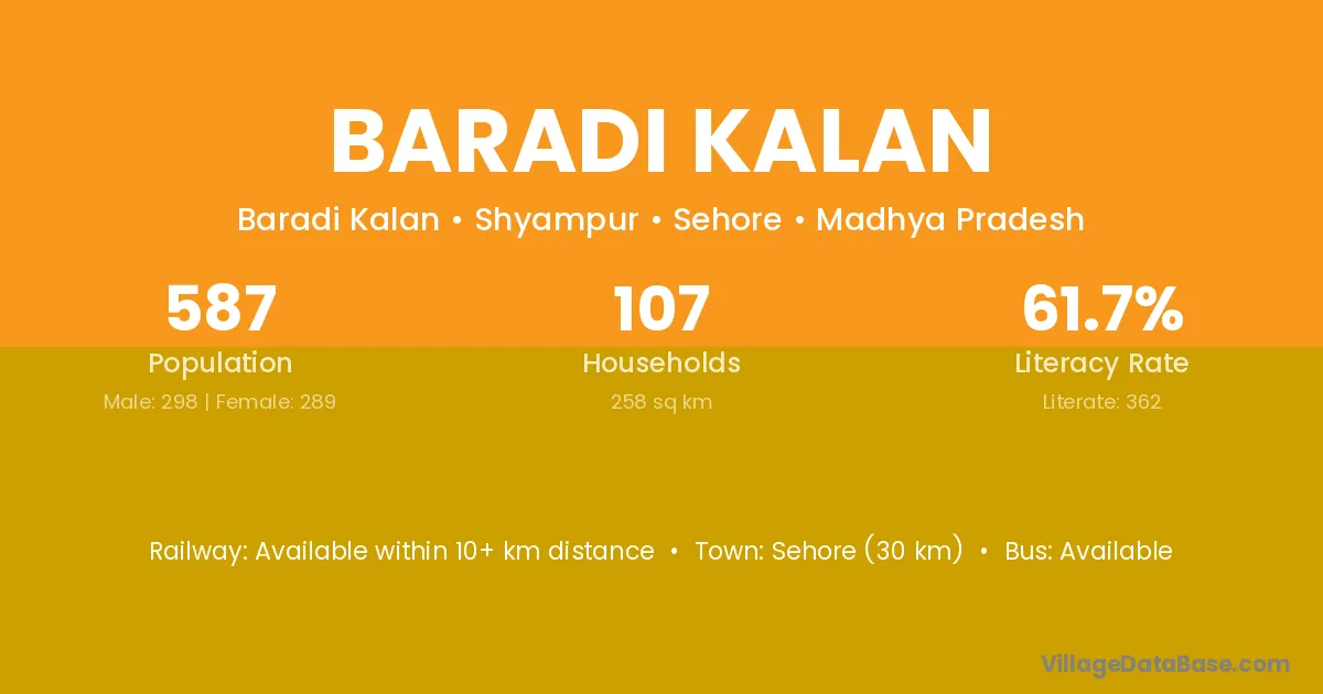 Sehore (30 km) is the nearest town to Baradi Kalan village for major economic activities and is located approximately 30 km away.