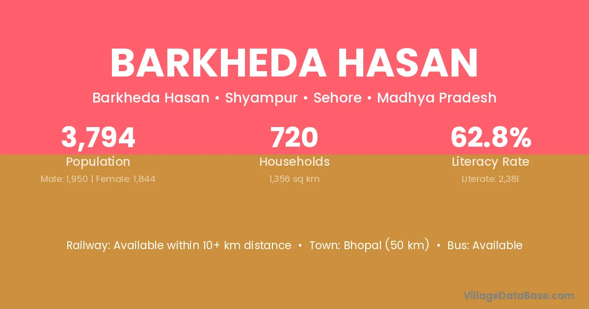 Barkheda Hasan village has a total population of 3,794 people, of which 1,950 are males and 1,844 are females.