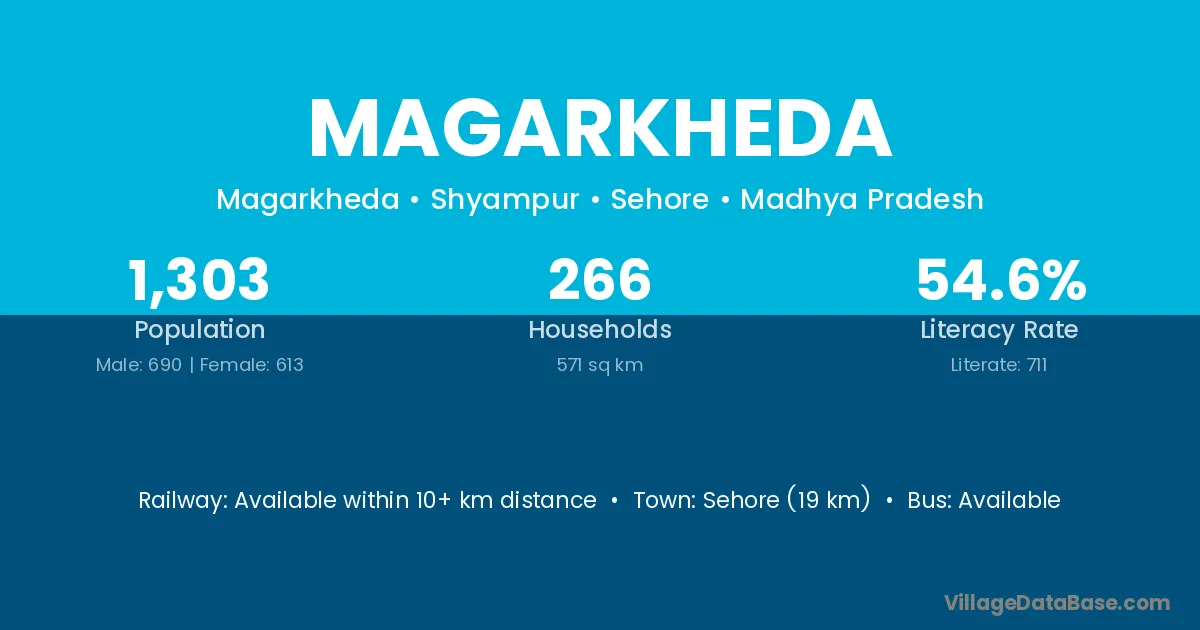 Sehore (19 km) is the nearest town to Magarkheda village for major economic activities and is located approximately 19 km away.