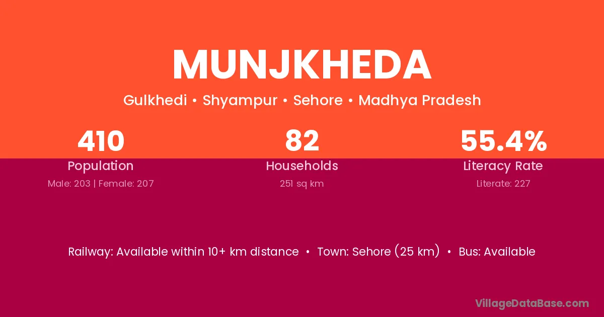 Sehore (25 km) is the nearest town to Munjkheda village for major economic activities and is located approximately 25 km away.