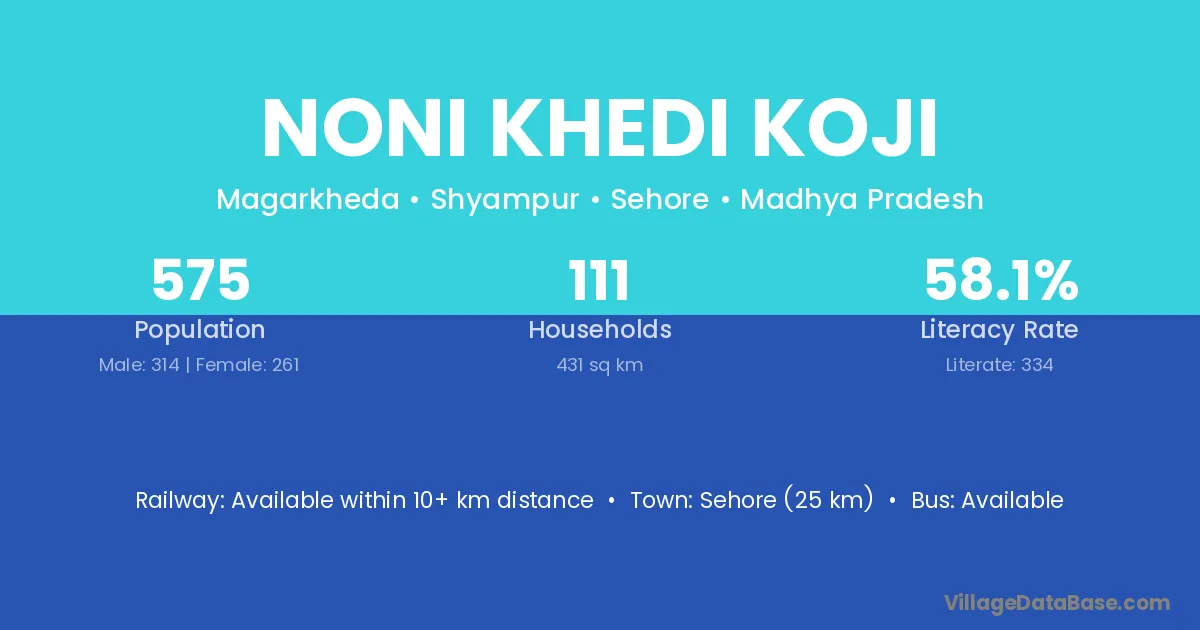 Sehore (25 km) is the nearest town to Noni Khedi Koji village for major economic activities and is located approximately 25 km away.