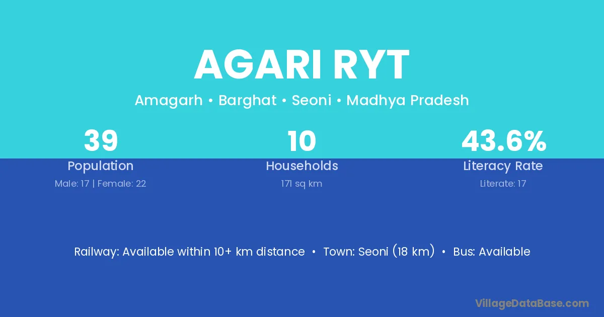 Seoni (18 km) is the nearest town to Agari Ryt village for major economic activities and is located approximately 18 km away.