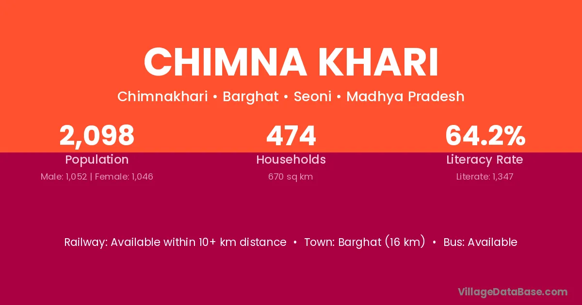 Chimna Khari village has a total population of 2,098 people, of which 1,052 are males and 1,046 are females.