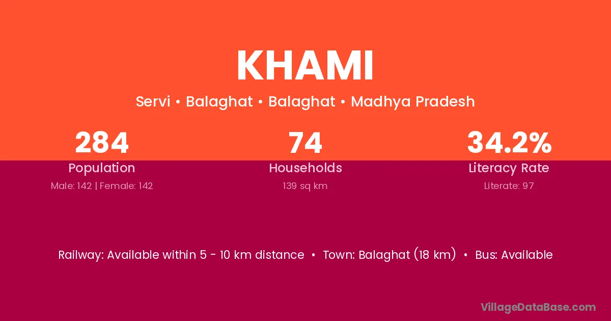 The literacy rate of Khami village is 72.09%. Male literacy stands at 80.24% and female literacy at 63.77%.