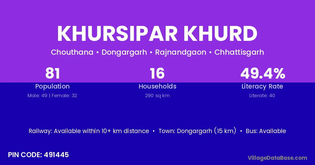 The literacy rate of Khursipar Khurd village is 63.80%. Male literacy stands at 74.17% and female literacy at 54.41%.