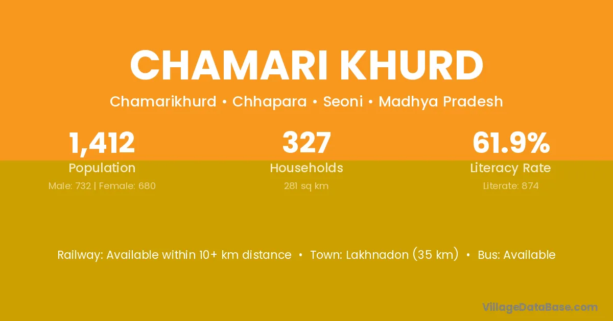 Lakhnadon (35 km) is the nearest town to Chamari Khurd village for major economic activities and is located approximately 35 km away.