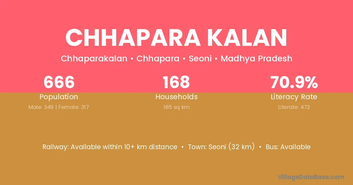 Seoni (32 km) is the nearest town to Chhapara Kalan village for major economic activities and is located approximately 32 km away.