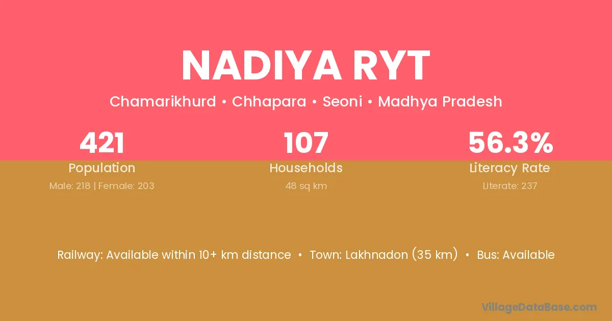 Lakhnadon (35 km) is the nearest town to Nadiya Ryt village for major economic activities and is located approximately 35 km away.