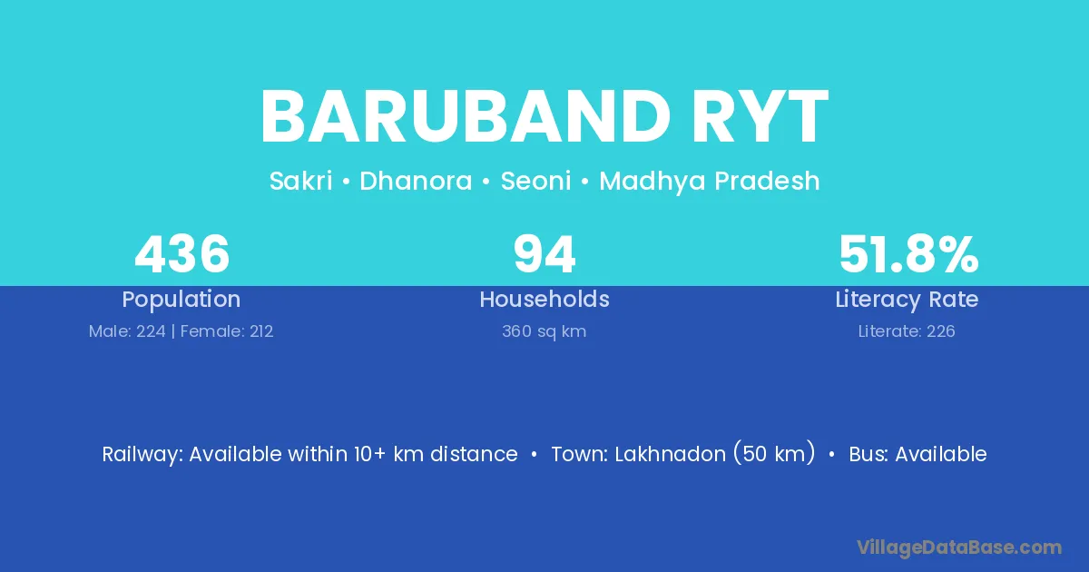 Lakhnadon (50 km) is the nearest town to Baruband Ryt village for major economic activities and is located approximately 50 km away.