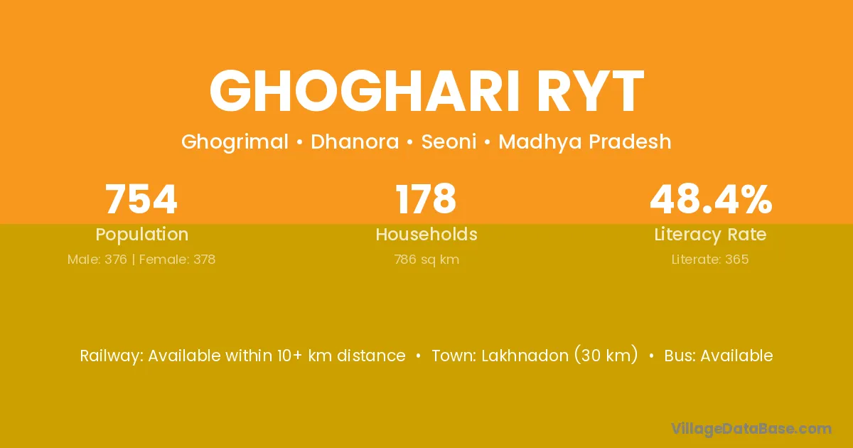 Lakhnadon (30 km) is the nearest town to Ghoghari Ryt village for major economic activities and is located approximately 30 km away.