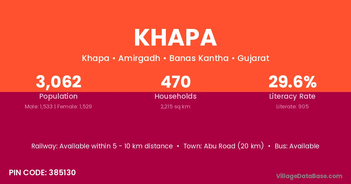 The literacy rate of Khapa village is 53.50%. Male literacy stands at 60.87% and female literacy at 46.43%.