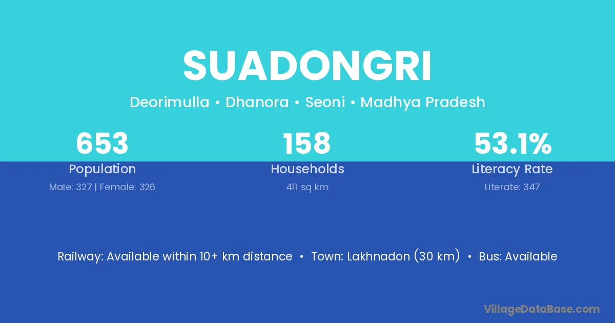 Lakhnadon (30 km) is the nearest town to Suadongri village for major economic activities and is located approximately 30 km away.