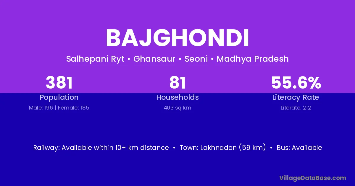 Lakhnadon (59 km) is the nearest town to Bajghondi village for major economic activities and is located approximately 59 km away.