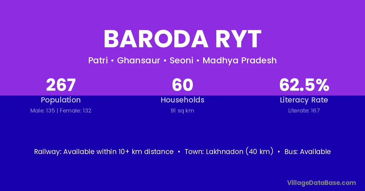 Lakhnadon (40 km) is the nearest town to Baroda Ryt village for major economic activities and is located approximately 40 km away.