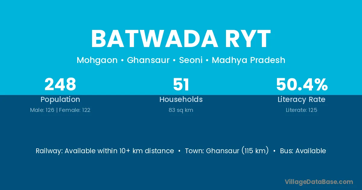 Batwada Ryt village has a total population of 248 people, of which 126 are males and 122 are females.