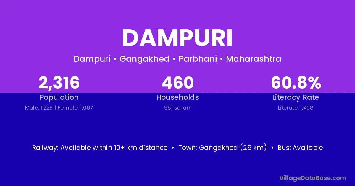 The literacy rate of Dampuri village is 44.85%. Male literacy stands at 57.03% and female literacy at 33.74%.