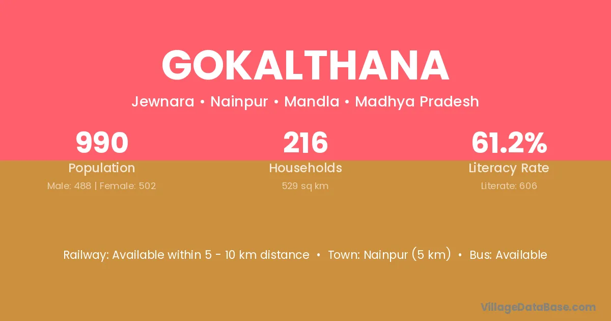 Jabalpur (83 km) is the nearest town to Gokalthana village for major economic activities and is located approximately 83 km away.